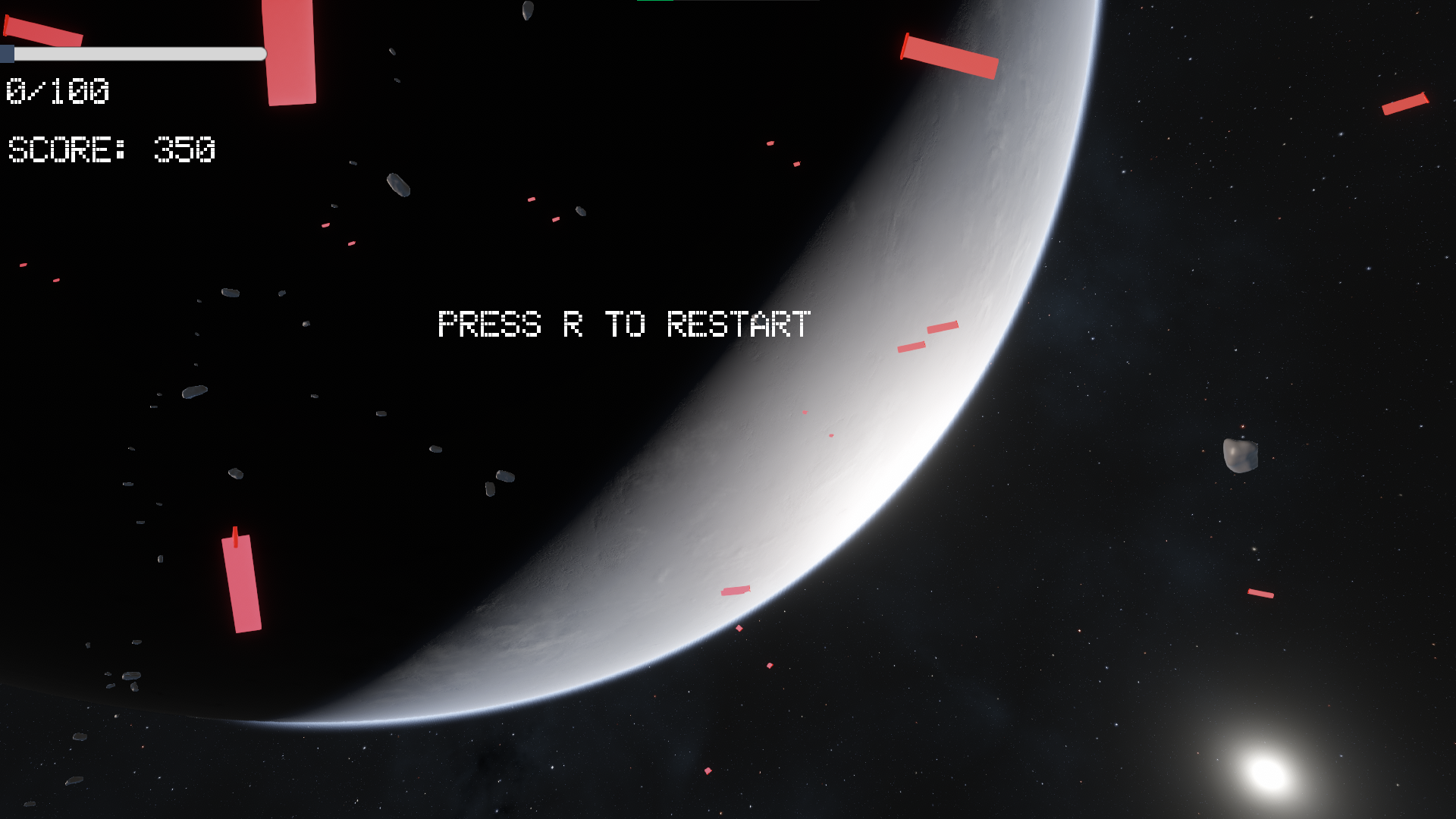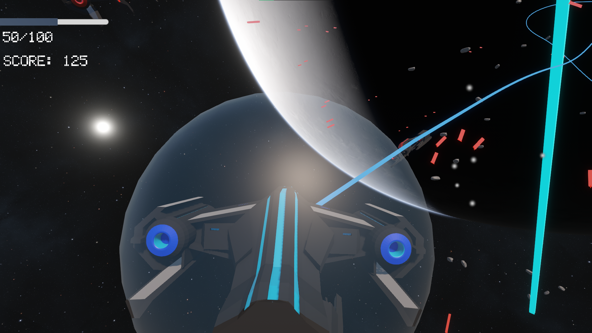 A Sort of infinite game where you just attempt to achieve the highest score you can defeating enemies, powerups and asteroids spawn and there are diffferent types of enemies that will come at you